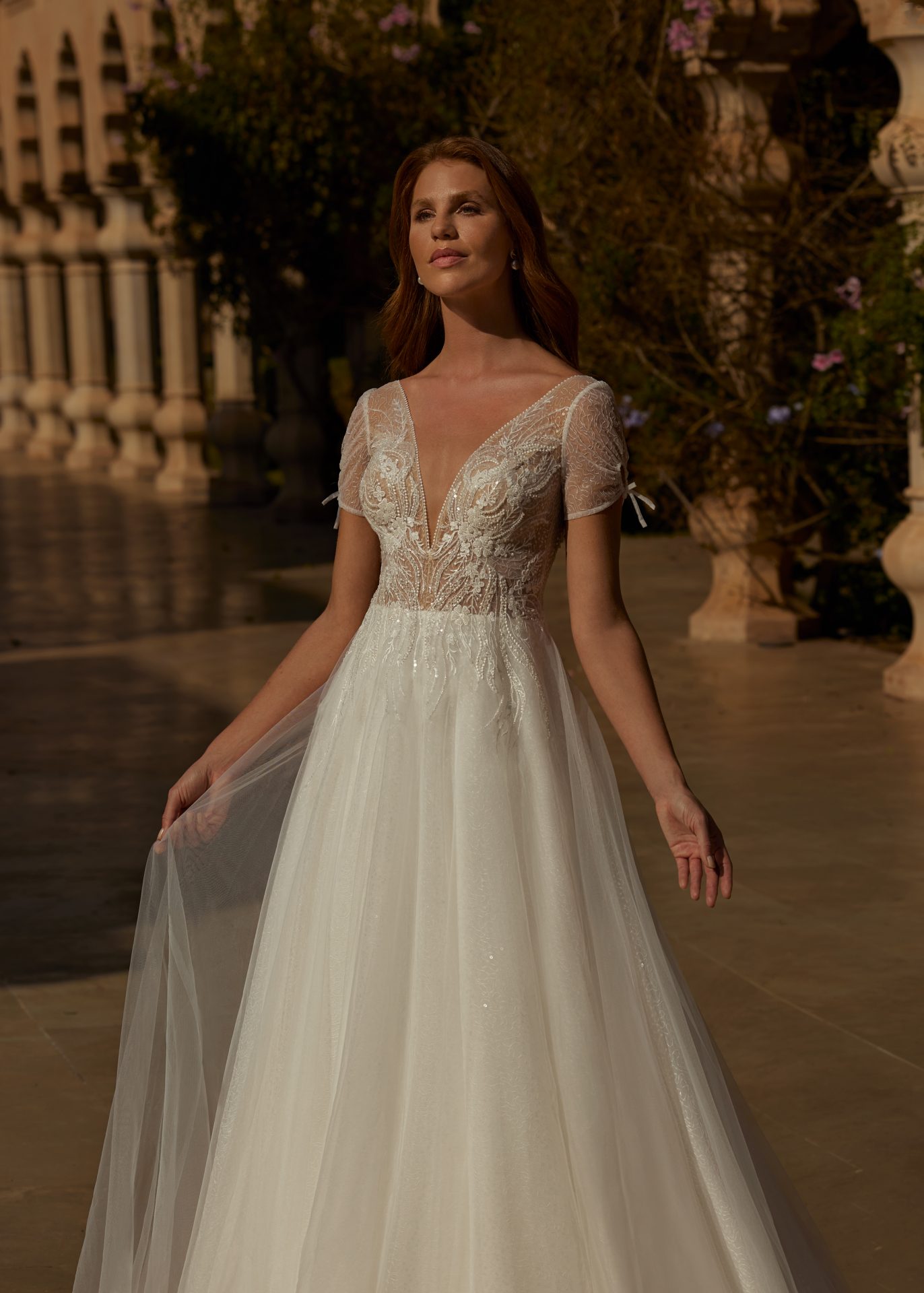 Für die moderne Braut, die zeitlose Eleganz schätzt, bietet dieses Kleid eine atemberaubende A-Linien-Silhouette. Die Kombination aus kurzen Ärmeln und einem tiefen V-Ausschnitt schafft eine wunderschöne Balance aus Anmut und Stil. Der spektakuläre Rückenausschnitt setzt ein klares Statement und verleiht dem Kleid eine gewagte Note.