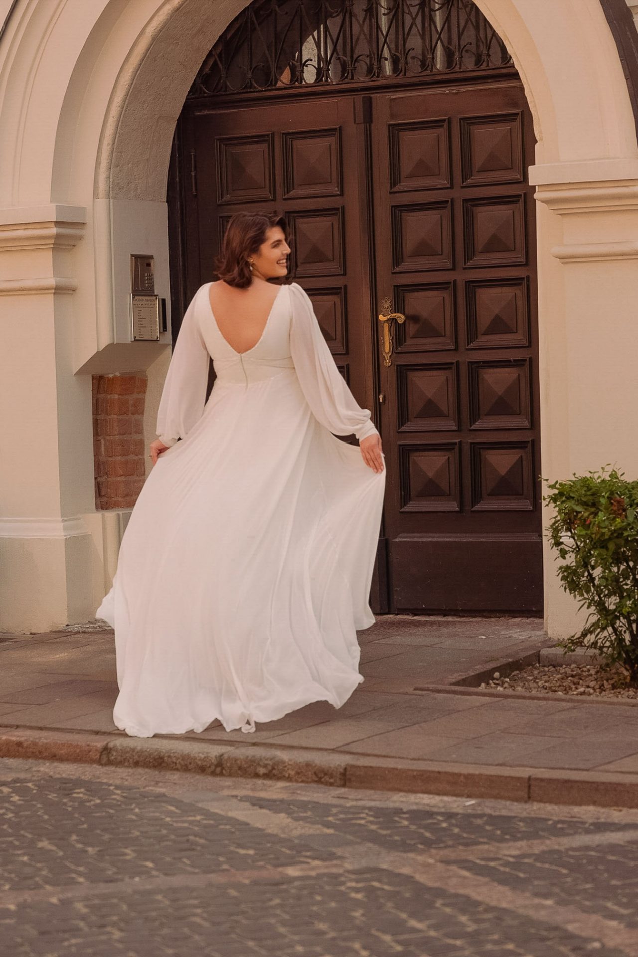 Die hochwertige Verarbeitung und der zarte Chiffon machen dieses Kleid zum idealen Begleiter für Deinen großen Tag. Die klassische weiße Farbe sorgt für zeitlose Schönheit und lässt sich hervorragend mit Deinen Lieblingsaccessoires kombinieren.
