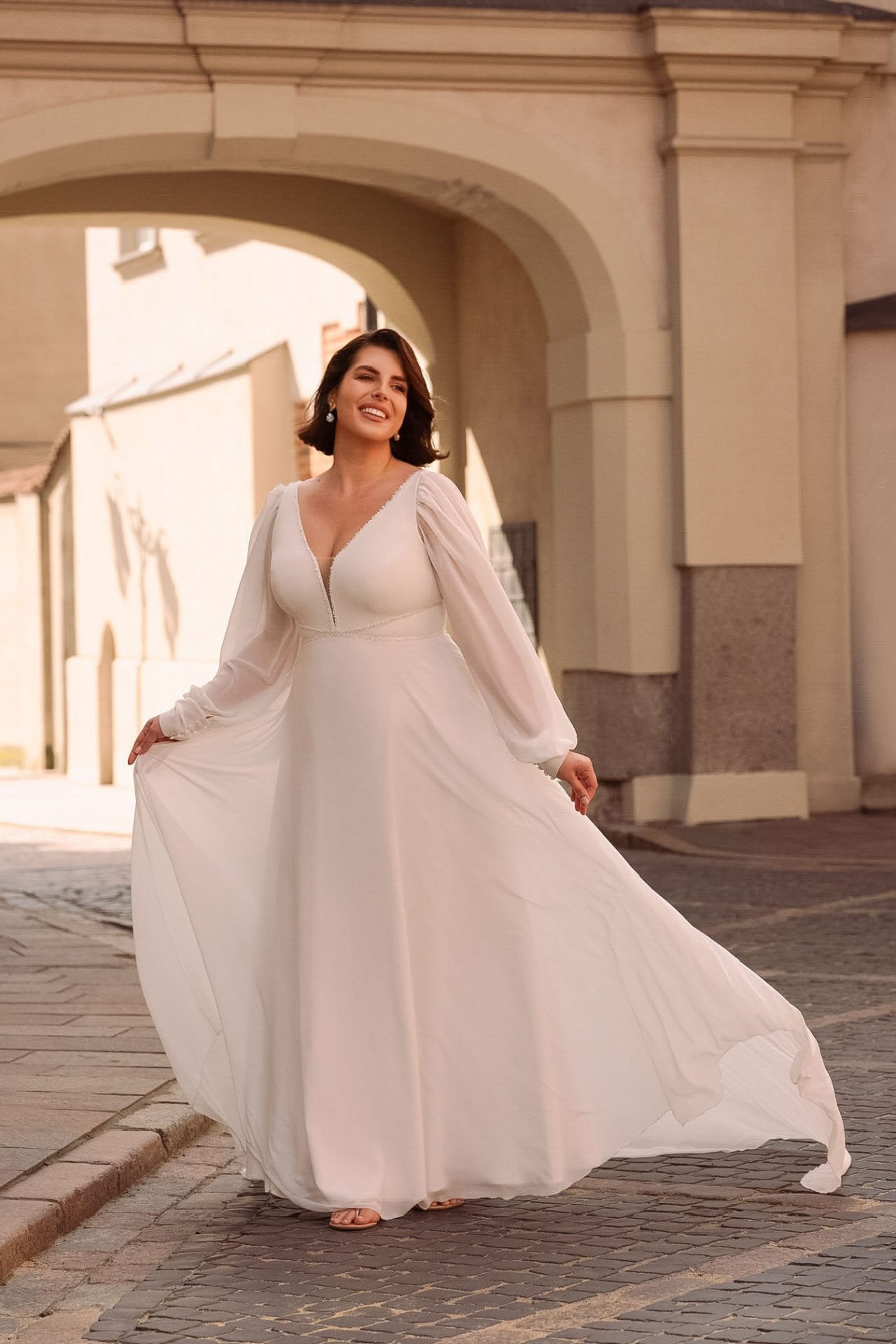 Entdecke das Brautkleid, das Deine Kurven umschmeichelt und Deine Persönlichkeit strahlen lässt! Dieses elegante A-Linien-Kleid kombiniert zeitlose Romantik mit einem Hauch von Modernität und bietet Dir höchsten Tragekomfort. Egal, ob Du von einer Märchenhochzeit träumst oder ein modernes Ambiente bevorzugst – dieses Kleid ist Dein stilvoller Begleiter.