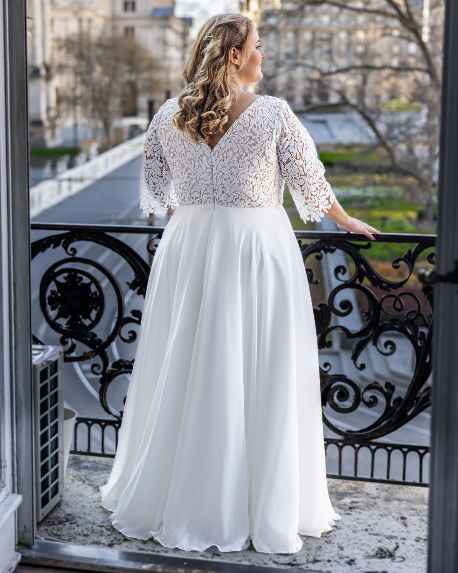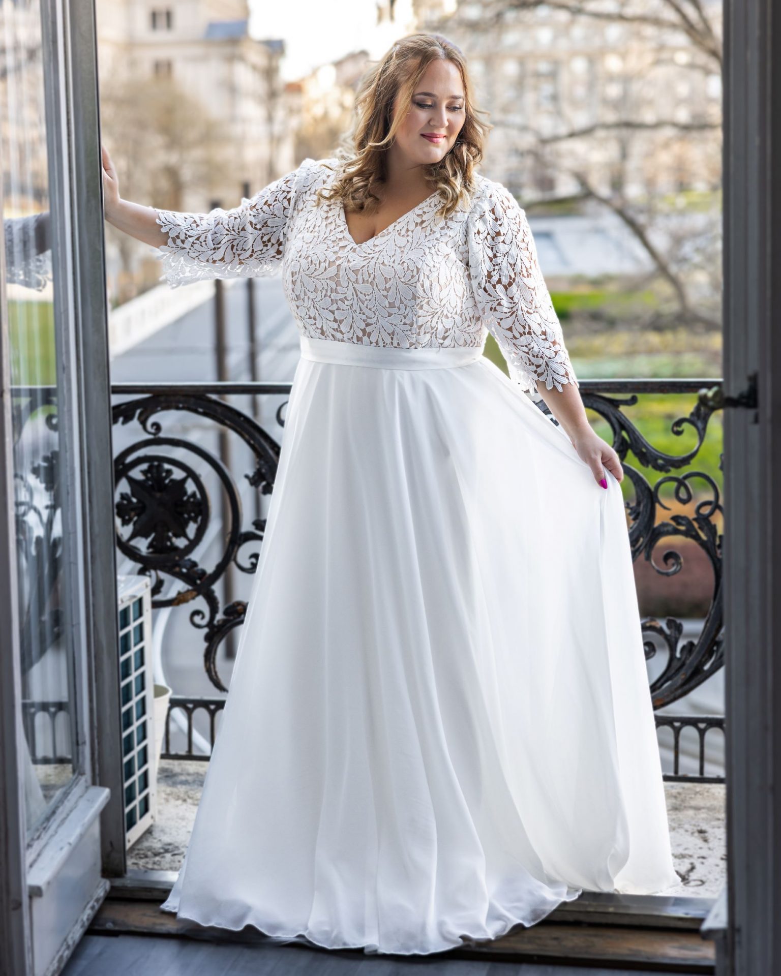 Du suchst ein Brautkleid, das Deine natürliche Schönheit unterstreicht und gleichzeitig bequem ist? Dieses Plus-Size-Brautkleid verbindet feminine Eleganz mit einem Hauch von Leichtigkeit – perfekt für Deinen unvergesslichen Tag! Die florale Spitze, der schmeichelhafte V-Ausschnitt und der fließende Chiffonrock sorgen dafür, dass Du Dich den ganzen Tag über wohlfühlst und strahlend schön aussiehst.