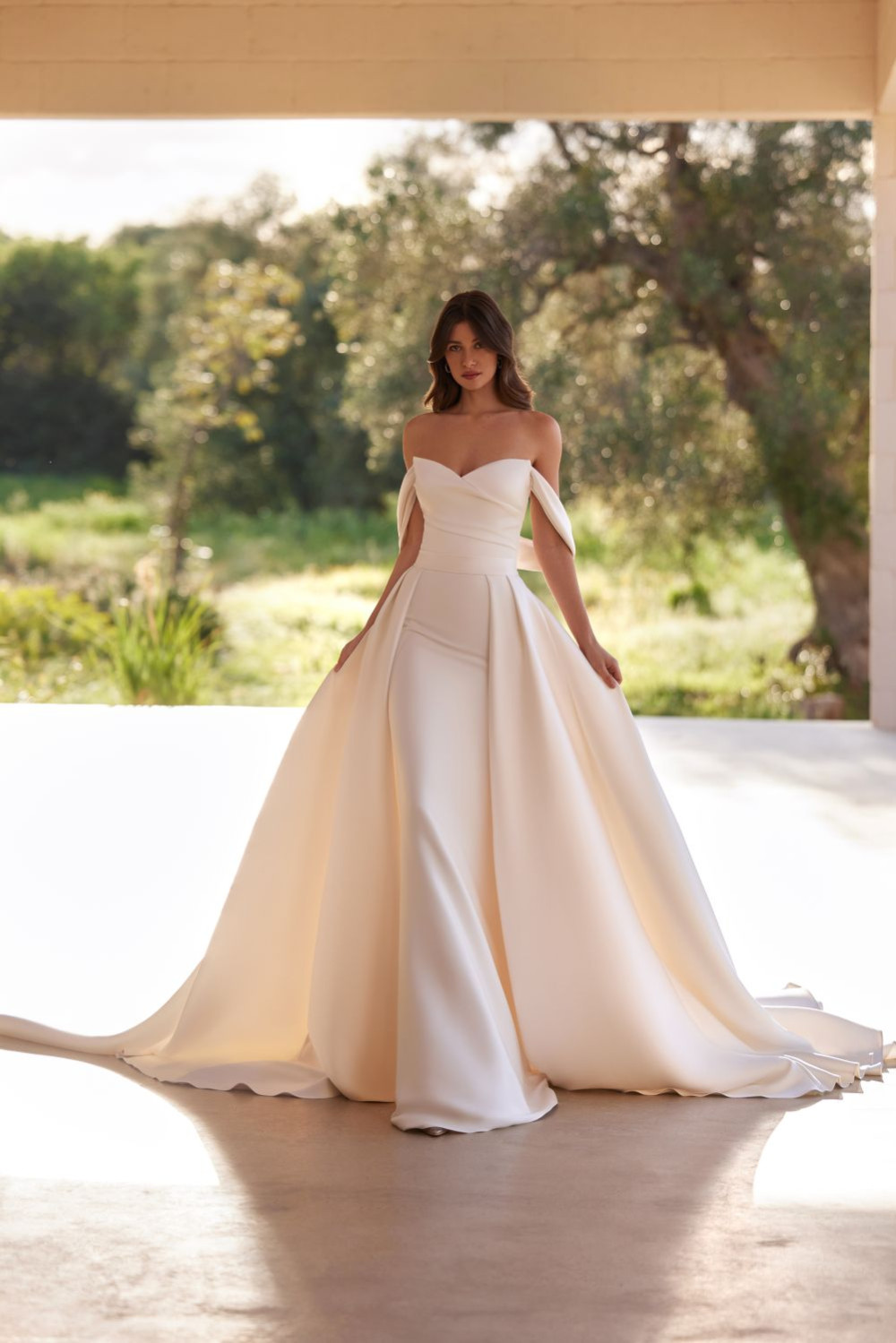 - Wandelbares Design: Fit-and-Flare-Silhouette mit abnehmbarem Overskirt – ideal für einen nahtlosen Übergang zwischen Zeremonie und Feier.