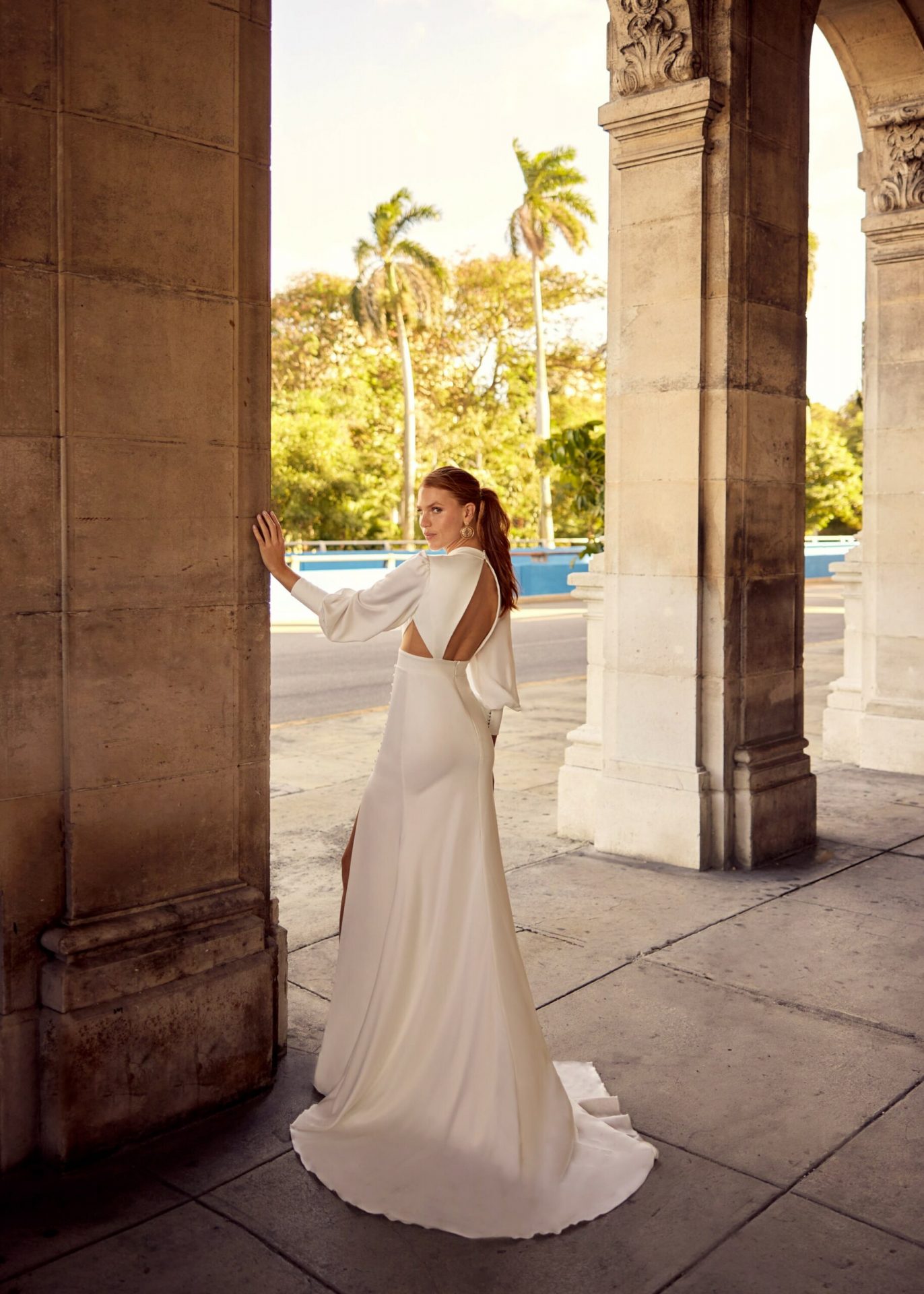 Modernes Hochzeitskleid mit elegantem Rückenausschnitt und raffinierten Details