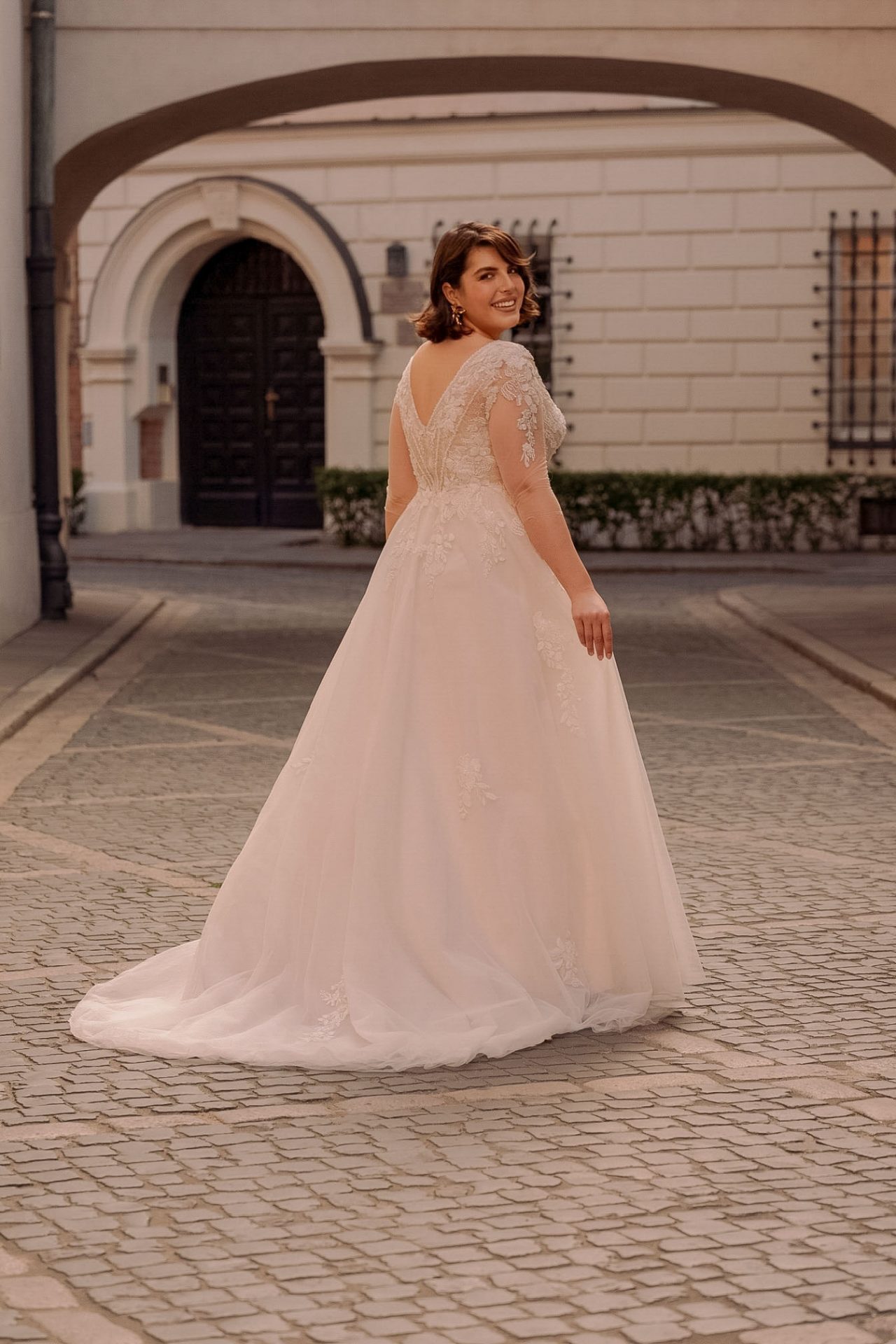 - Ärmel: Halbtransparente Tüllärmel mit detailverliebten Spitzenapplikationen.
