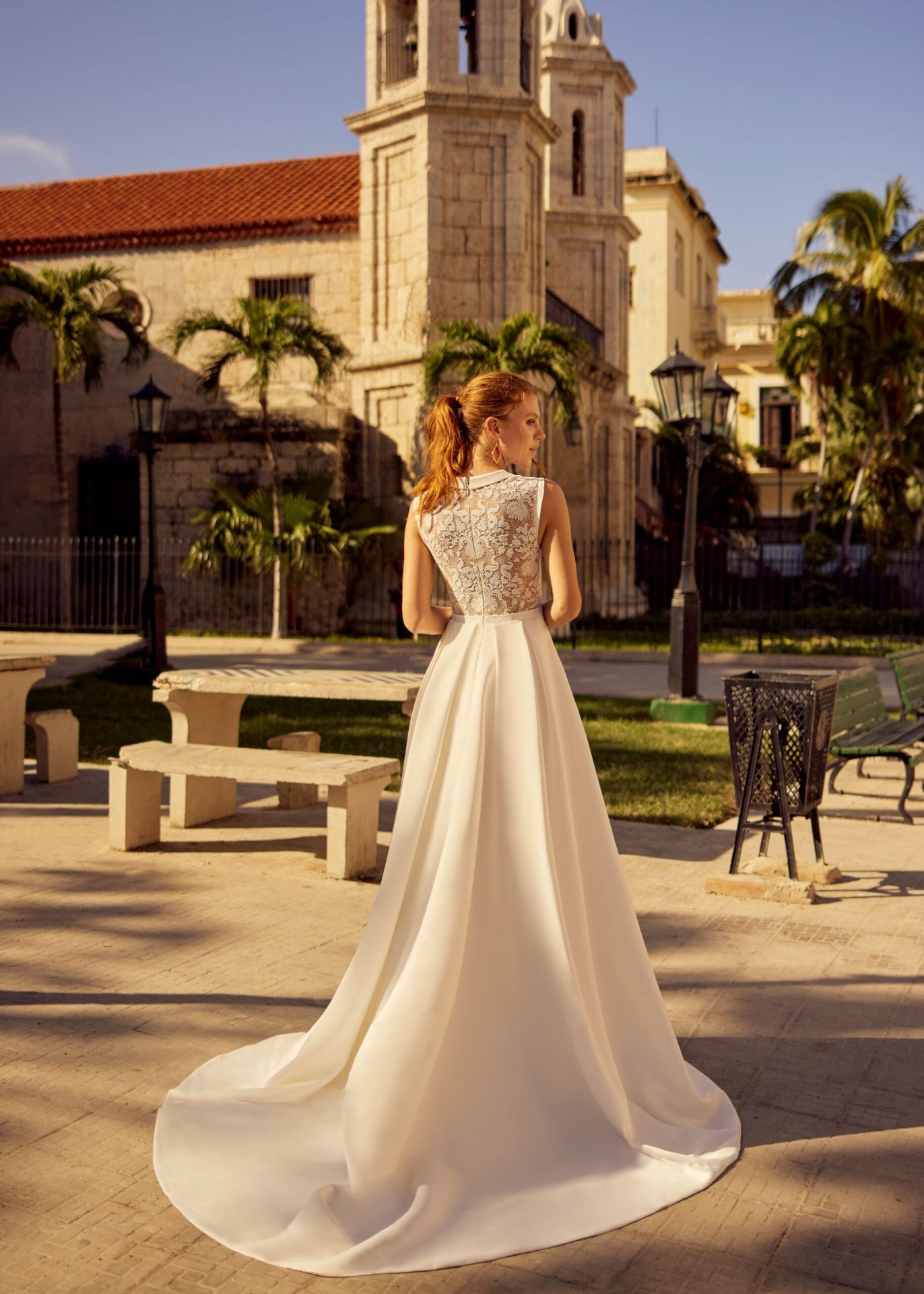 Dieses A-Linien-Brautkleid vereint moderne Eleganz mit romantischen Details. Mit seinem floralen Spitzenoberteil, einem schmeichelnden V-Ausschnitt und dem fließenden Rock aus edlem Satin bist Du perfekt gekleidet für Deinen großen Tag. Egal, ob Du eine Hochzeit im Boho-Stil, in einer mediterranen Altstadt oder klassisch in der Kirche planst – dieses Kleid passt sich Deinem Stil mühelos an. Jetzt Beratungstermin vereinbaren und Dein Traumkleid entdecken!
