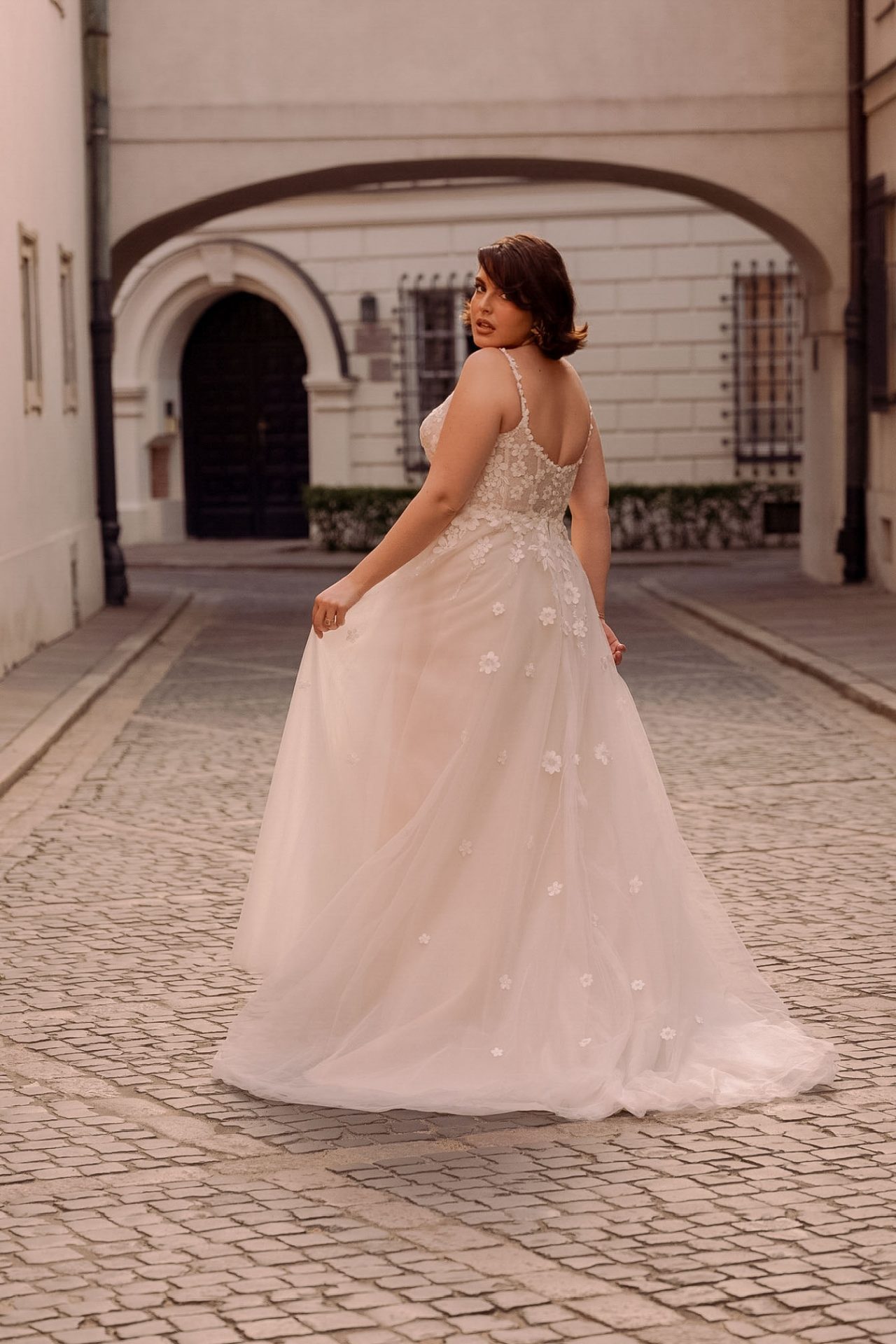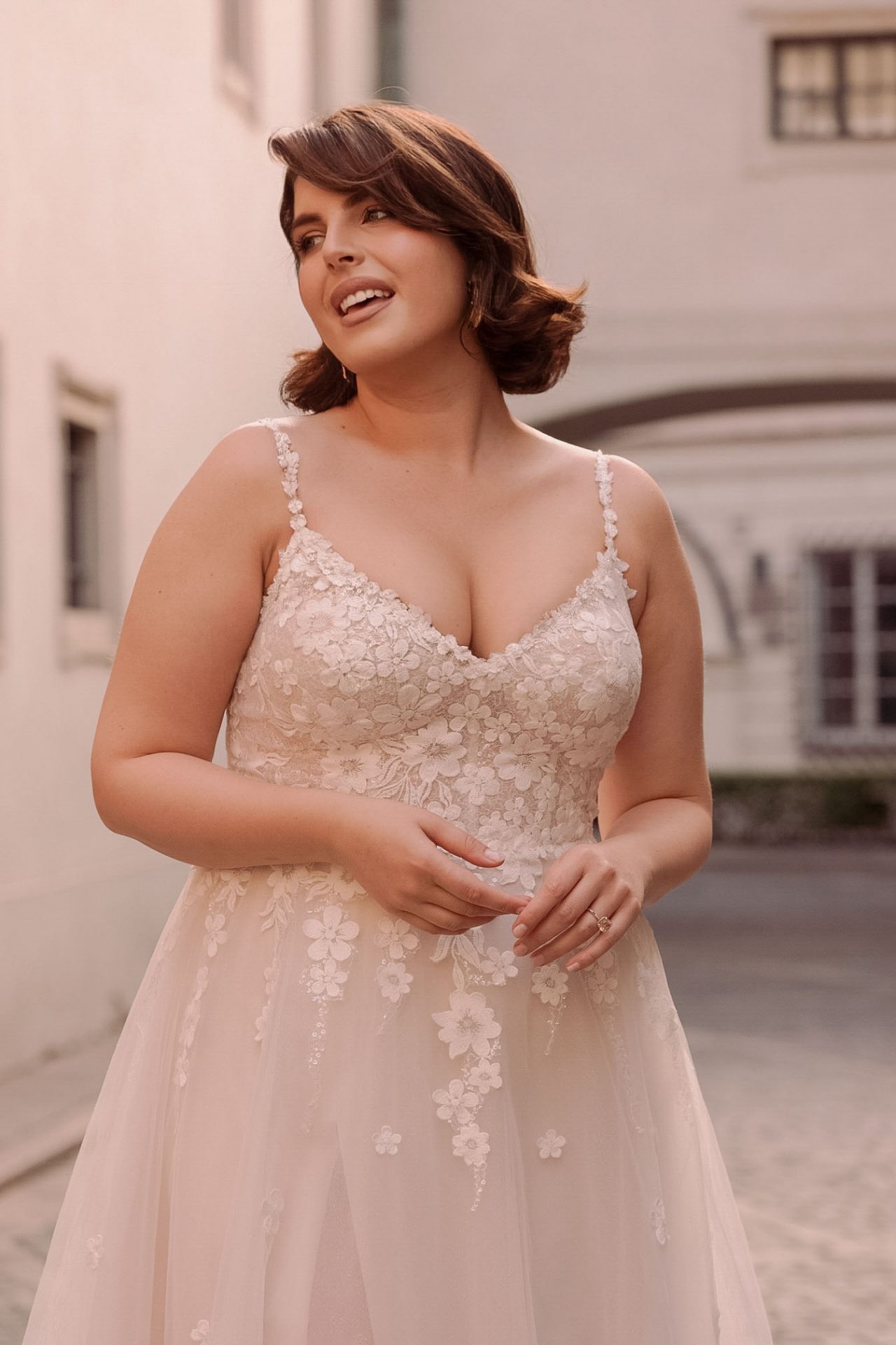 Entdecke dieses zauberhafte Brautkleid, das speziell für kurvige Frauen entworfen wurde, um Deine natürliche Schönheit hervorzuheben. Der elegante A-Linien-Schnitt zaubert eine feminine Silhouette, während die romantischen 3D-Blumenapplikationen und die edle Spitze den Look perfekt abrunden. Das luftige Tüll-Design sorgt nicht nur für einen traumhaften Auftritt, sondern auch für höchsten Tragekomfort – ideal für einen langen und unvergesslichen Hochzeitstag.