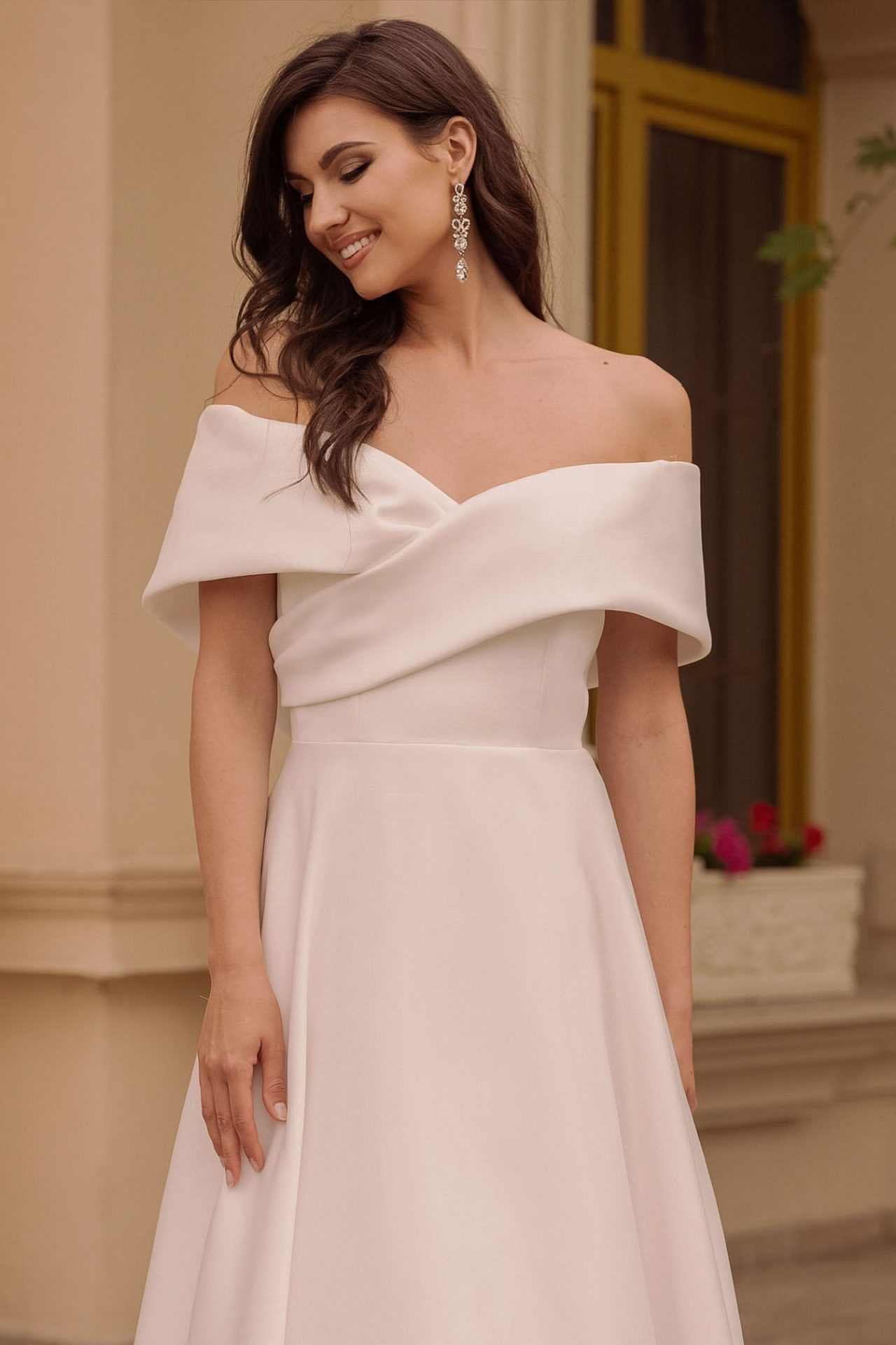 Du möchtest an Deinem großen Tag stilvoll und dennoch romantisch wirken? Dieses atemberaubende Brautkleid vereint schlichte Eleganz mit einem femininen Touch. Der schmeichelhafte A-Linien-Schnitt betont Deine Figur, während der edle Off-Shoulder-Ausschnitt Deine Schultern perfekt zur Geltung bringt. Gefertigt aus luxuriösem Mikado-Stoff überzeugt dieses Kleid mit einem hochwertigen, matten Finish – für einen Look, der gleichzeitig modern und zeitlos ist.