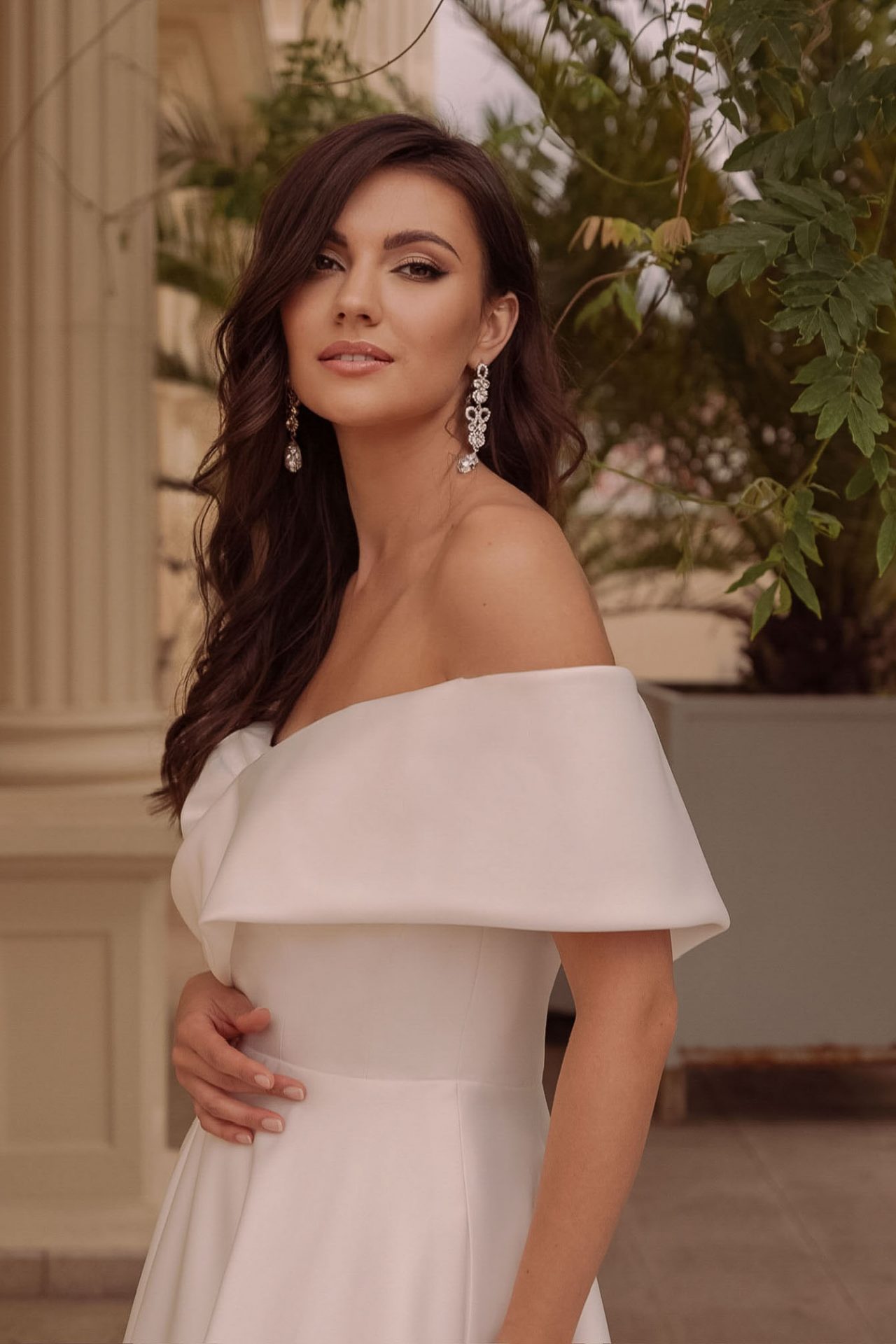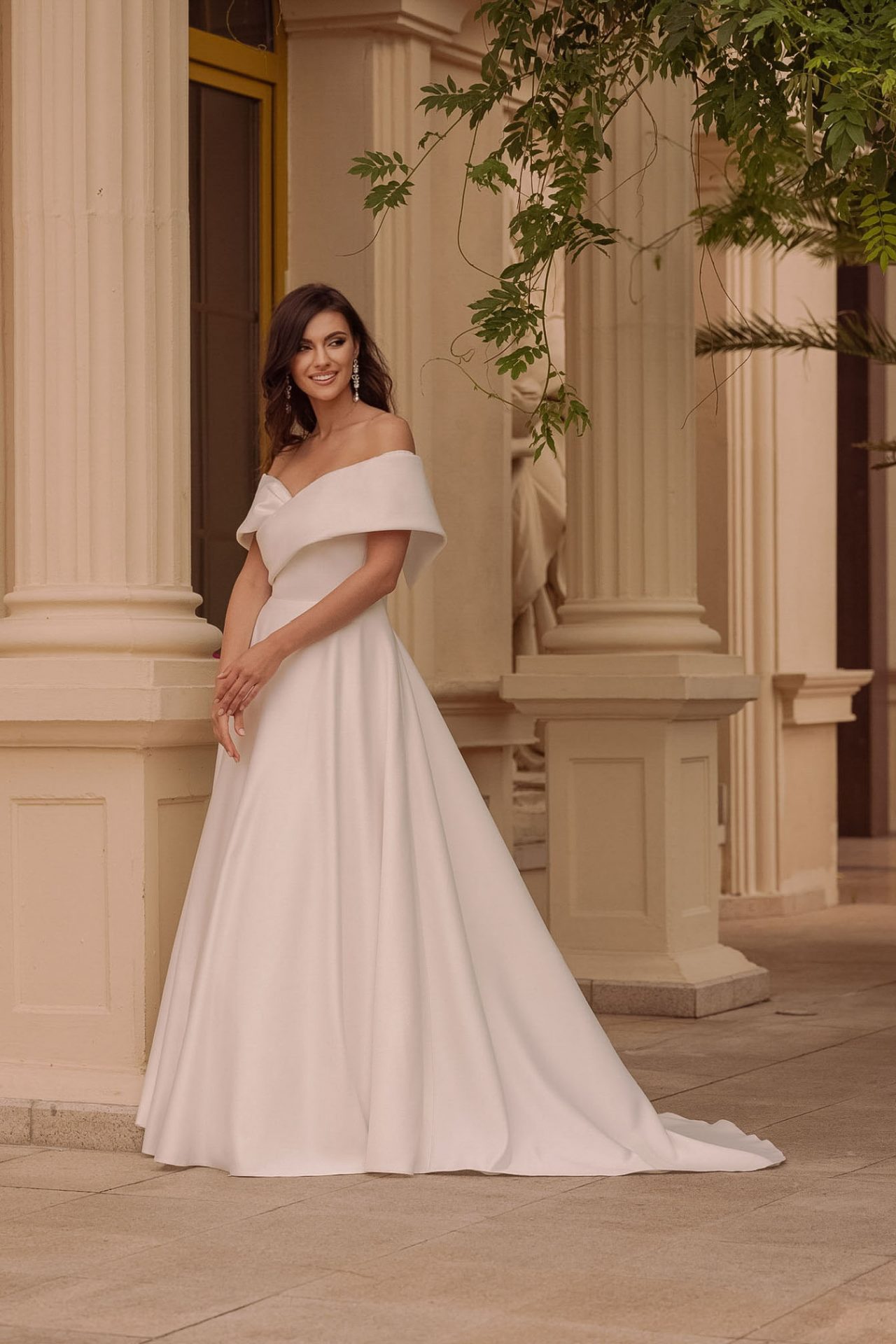 Dieses elegante Brautkleid passt perfekt zu klassischen und modernen Hochzeiten gleichermaßen. Ob in einer stilvollen Villa, einem historischen Schloss oder einem romantischen Garten – das Kleid ist vielseitig einsetzbar. Seine Schlichtheit macht es ideal für puristische Hochzeitskonzepte, während der Off-Shoulder-Ausschnitt einen Hauch von Glamour verleiht.