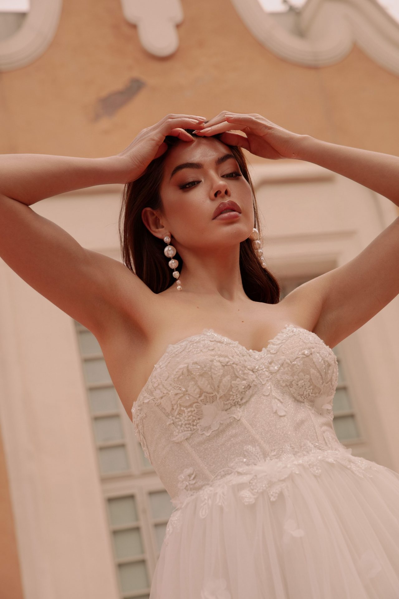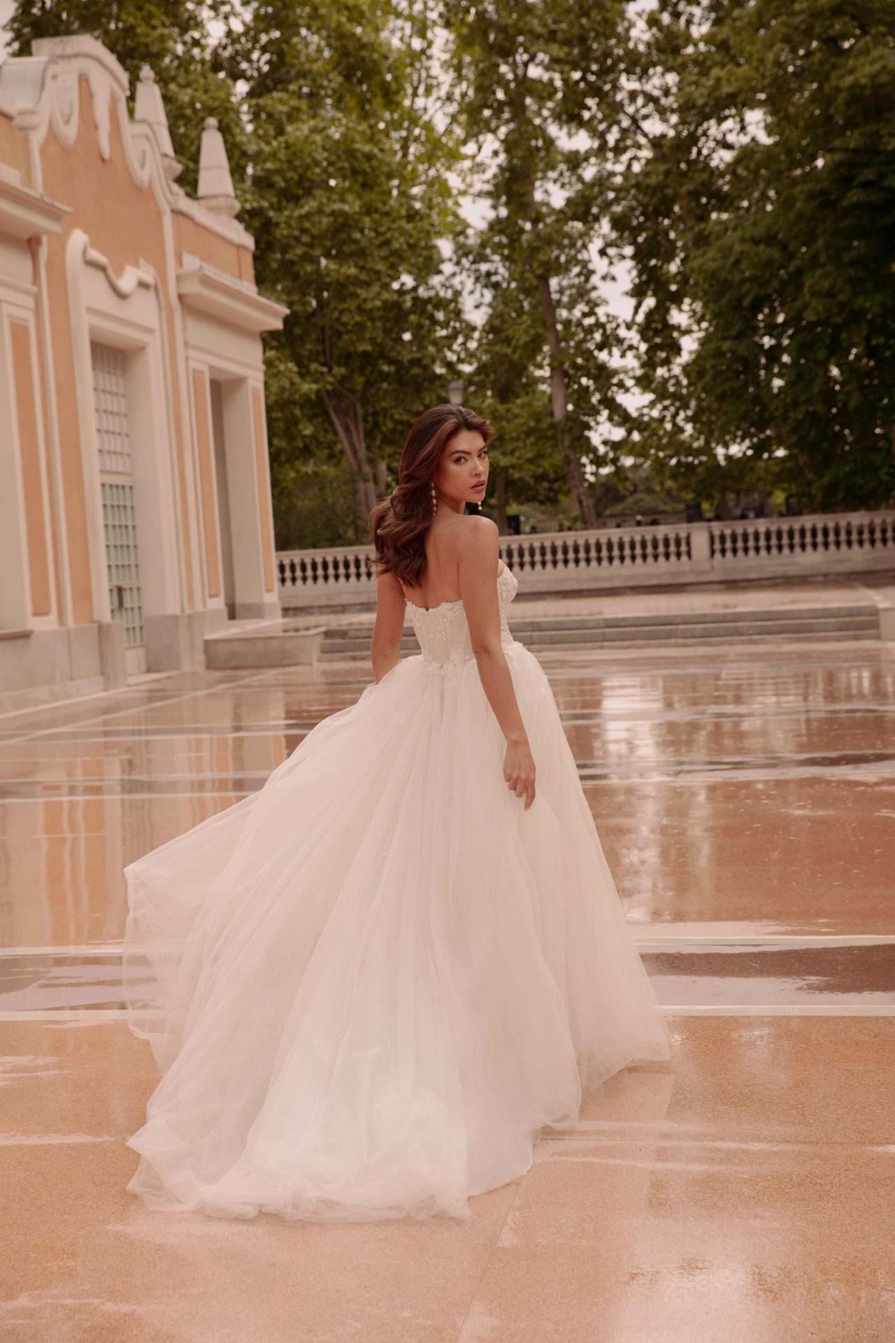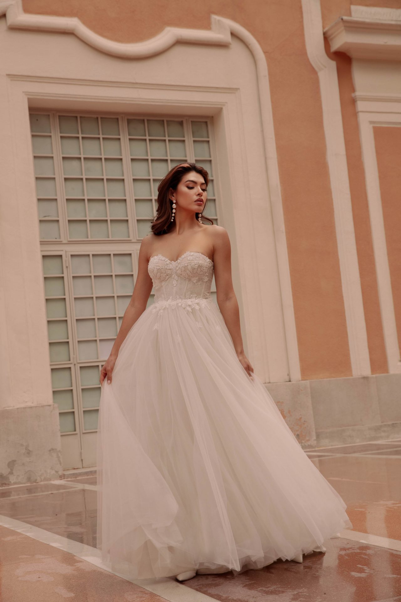 Brautkleid mit floraler Spitze, tiefem V-Ausschnitt und fließendem Tüllrock in der Vorderansicht vor einem historischen Gebäude