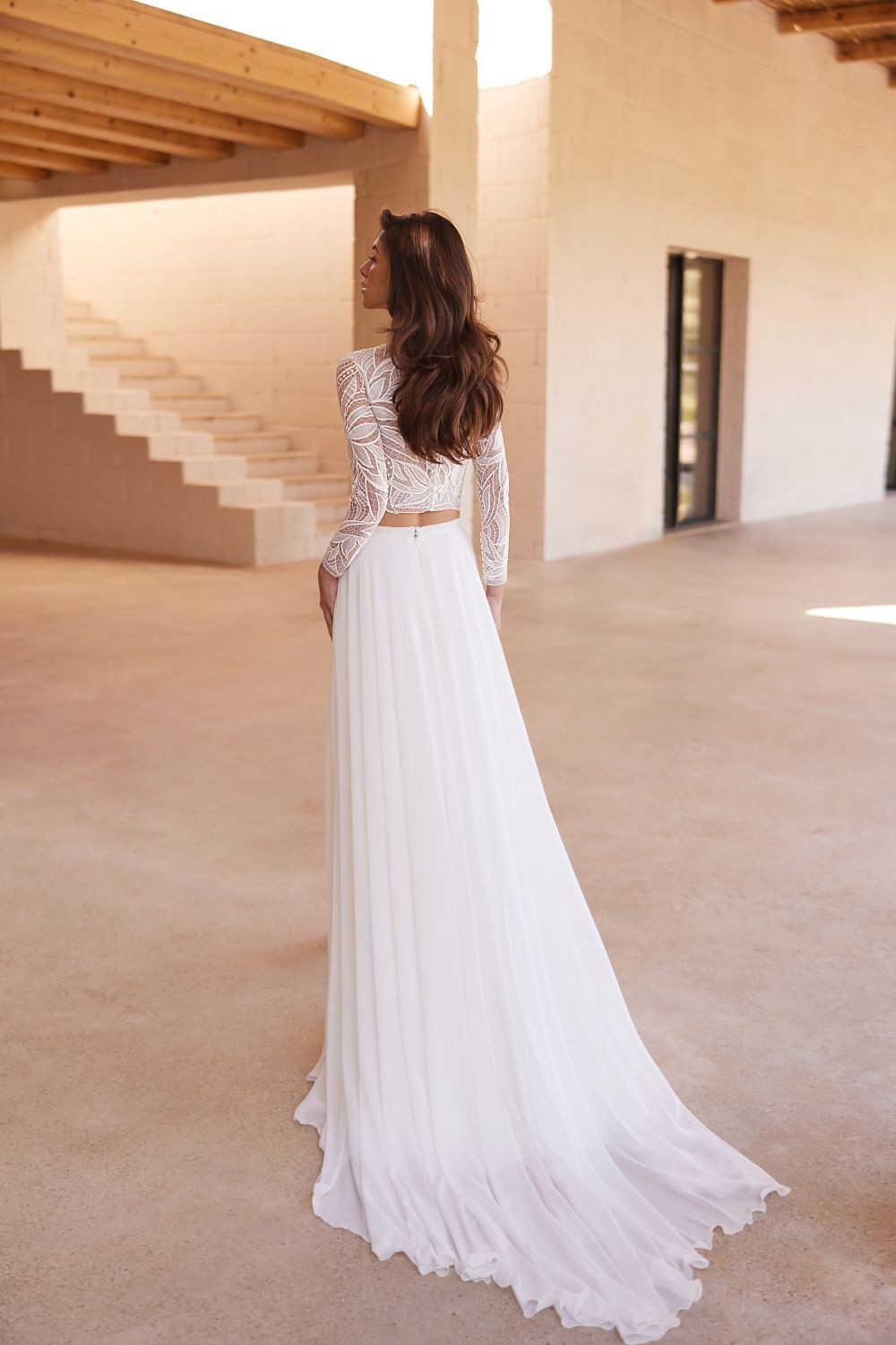 Dieses Kleid vereint moderne Eleganz mit romantischem Charme und ist wie gemacht für deinen großen Tag. Das zweiteilige Design aus einem floralen Spitzentop und einem fließenden Rock sorgt für einen unvergesslichen Look und ein unglaublich angenehmes Tragegefühl. Ob für eine Boho-Hochzeit im Freien oder eine minimalistische Feier – dieses Brautkleid wird dich und deine Gäste begeistern.