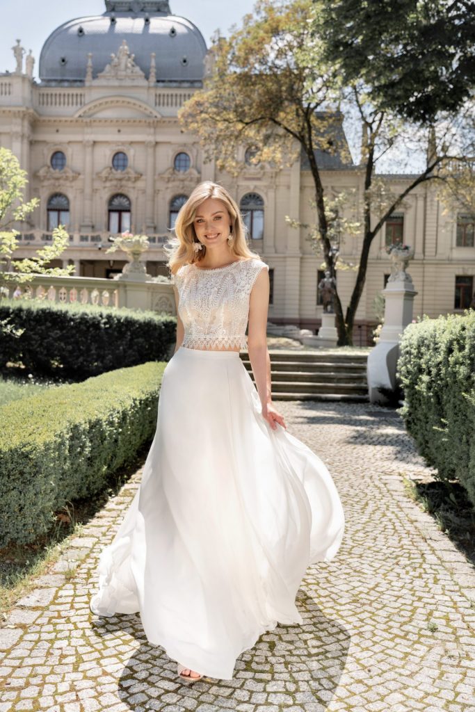 Zweiteiler sind die moderne Antwort aufs traditionelle Kleid. Du kombinierst Top und Rock oder Hose nach Deinem Geschmack – etwa ein Seidentop zu einer maßgeschneiderten Hose oder ein Spitzenoberteil zu einem fließenden Rock. Der Vorteil: Die Teile lassen sich später einzeln weitertragen.