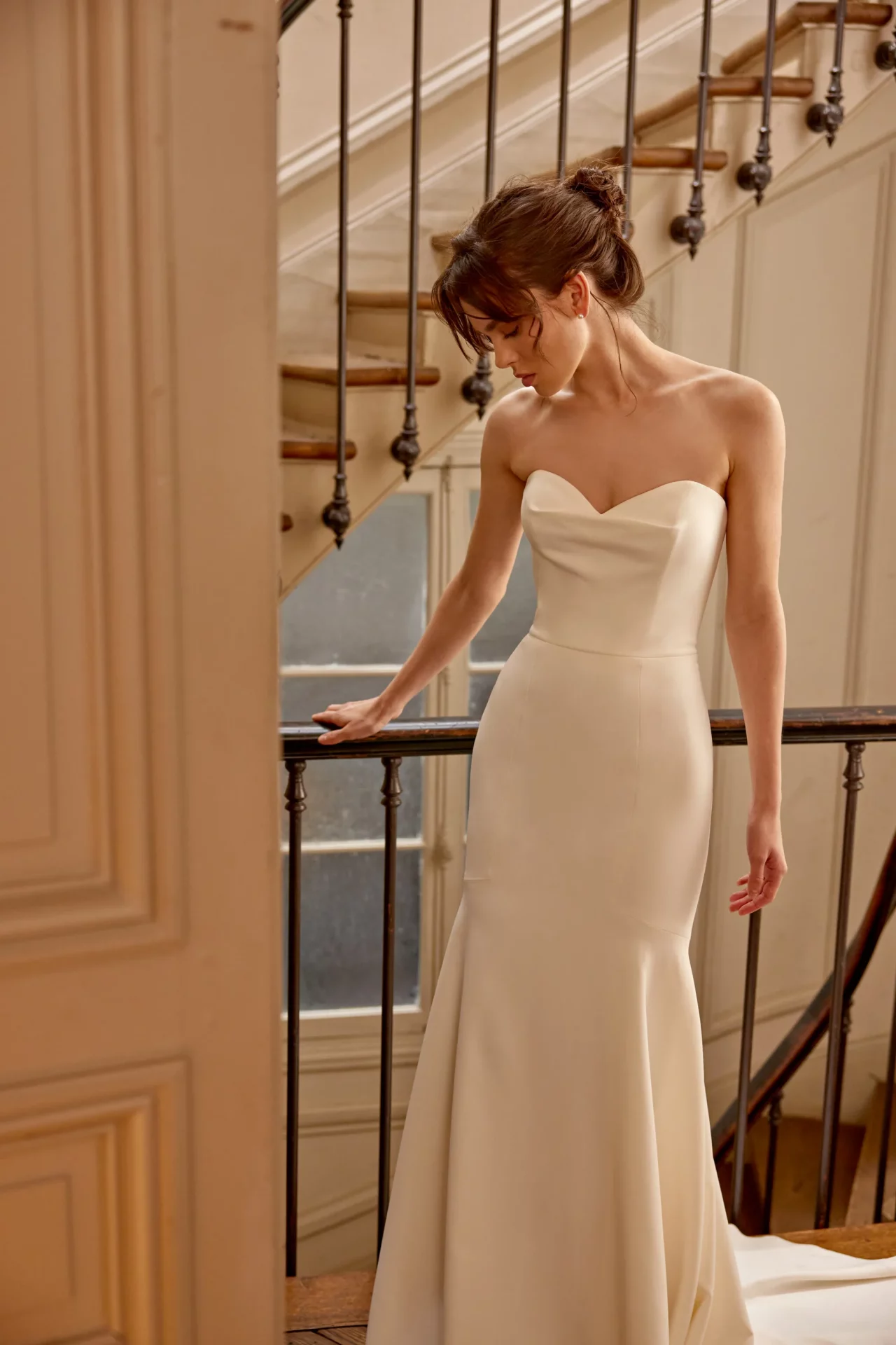 Unterstreiche Deinen puristischen Geschmack mit einem Clean-Chic-Hochzeitskleid in moderner Brautmode. Glatte Stoffe wie Crepe oder Satin, klare Schnitte und wenige Verzierungen setzen ein edles Statement. Dieser minimalistische Brautlook ist perfekt für Bräute, die zeitlose Eleganz schätzen und ganz auf Qualität und Passform setzen.