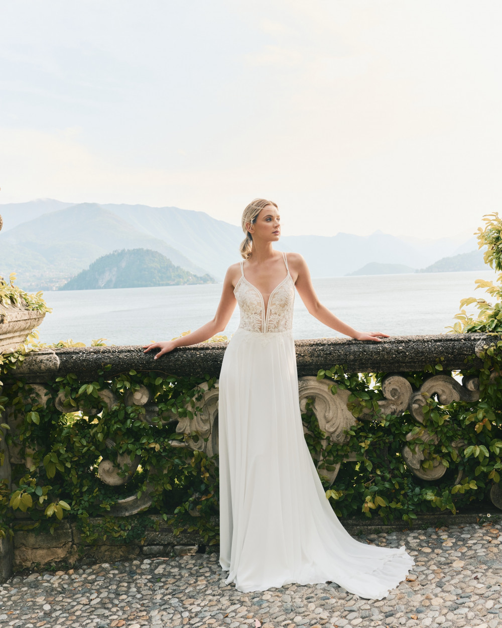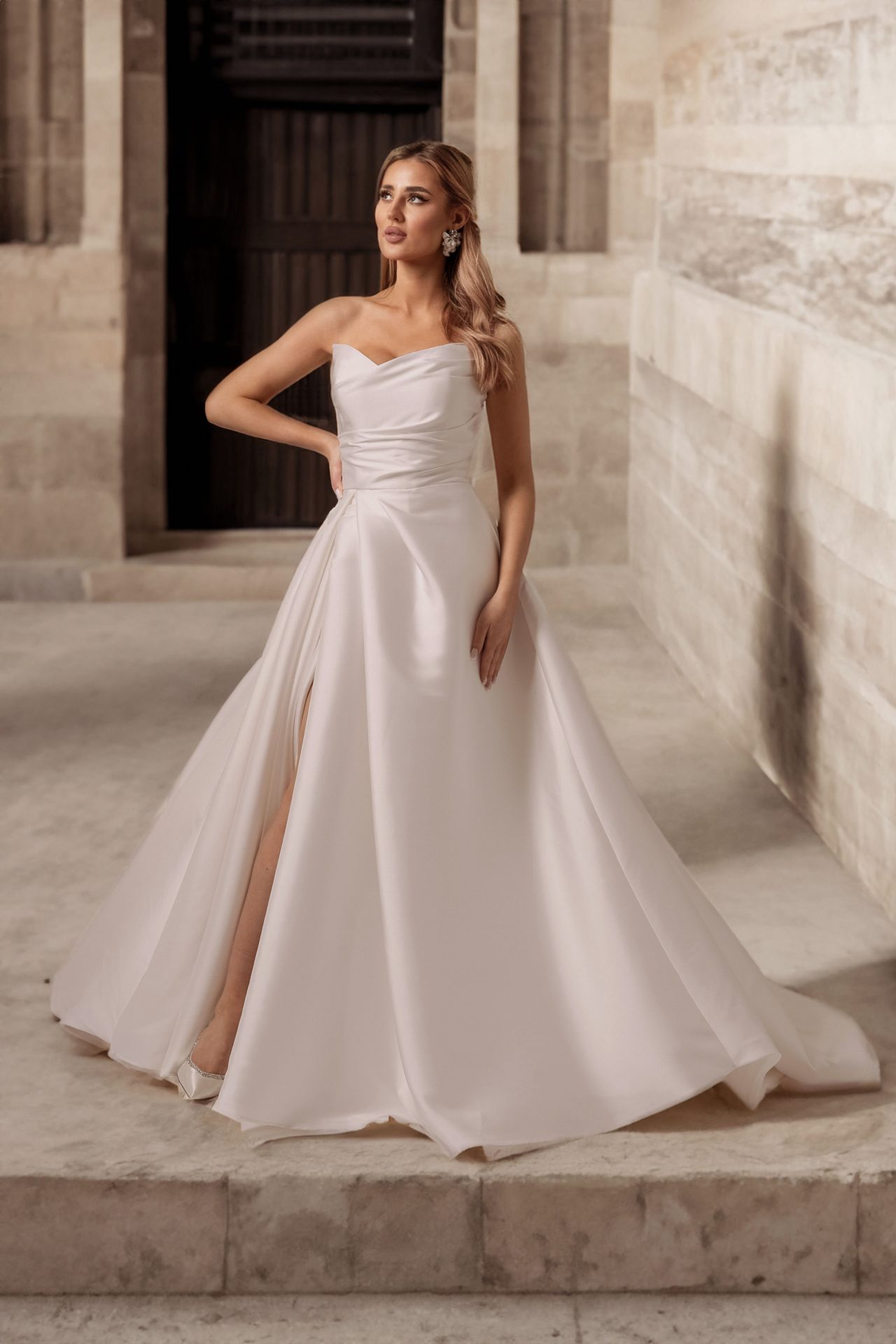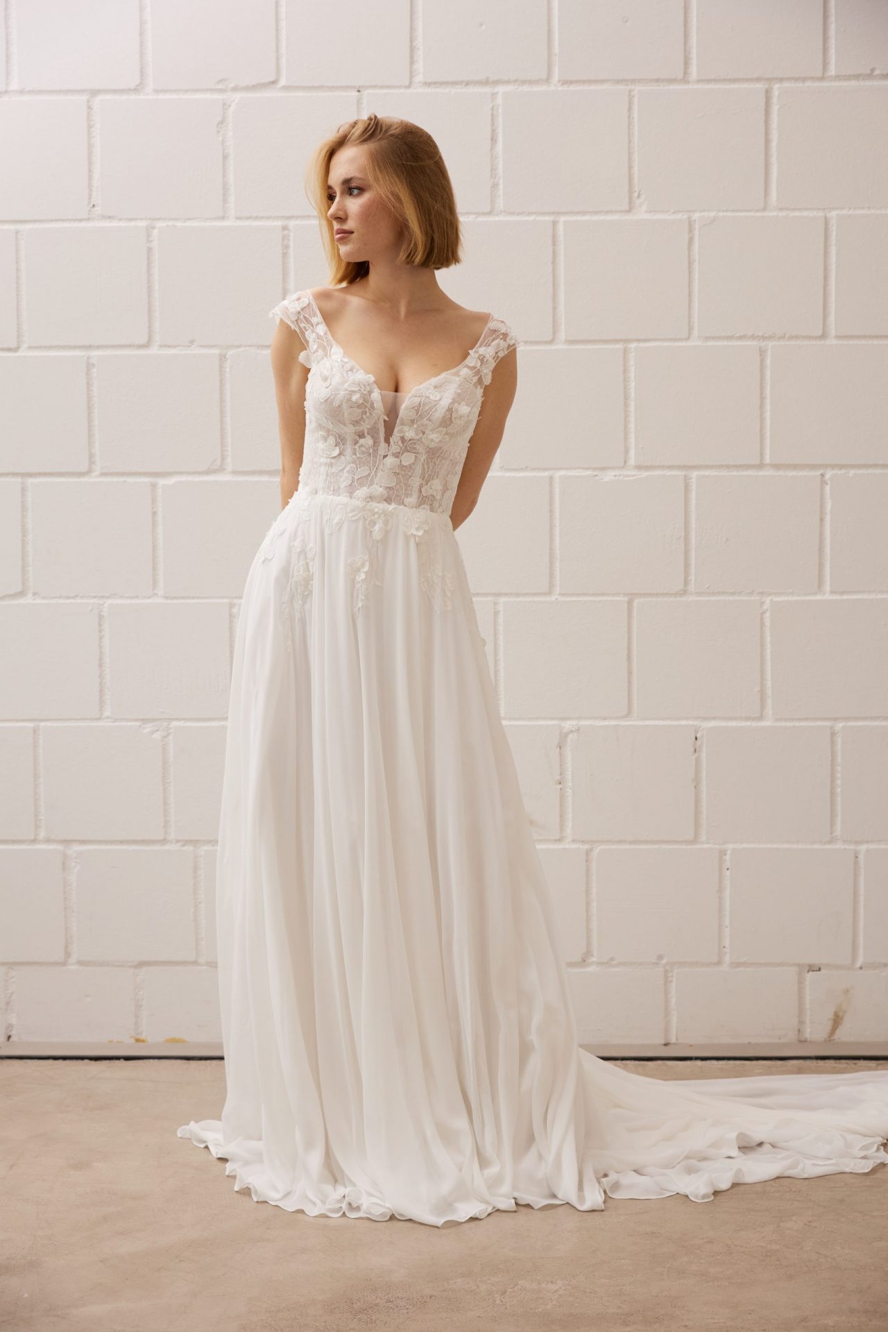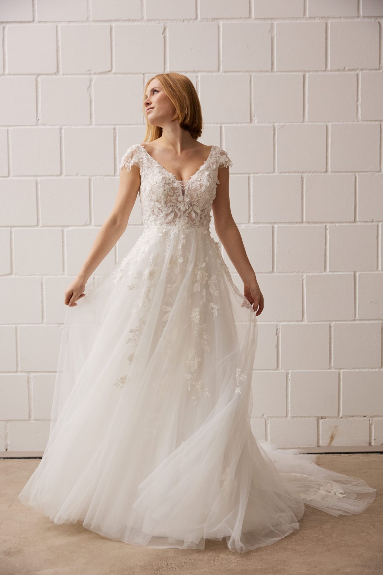 Eine Brautkleid-Silhouette in klassischer A-Linie überzeugt mit einem figurbetonten Oberteil und leicht ausgestelltem Rock. Dieser zeitlose Schnitt aus hochwertiger Brautmode umschmeichelt verschiedene Körperformen und verleiht Dir einen eleganten Look für Deinen großen Tag. Durch weiche Materialien und dezente Details wirkt das Hochzeitskleid romantisch und modern zugleich