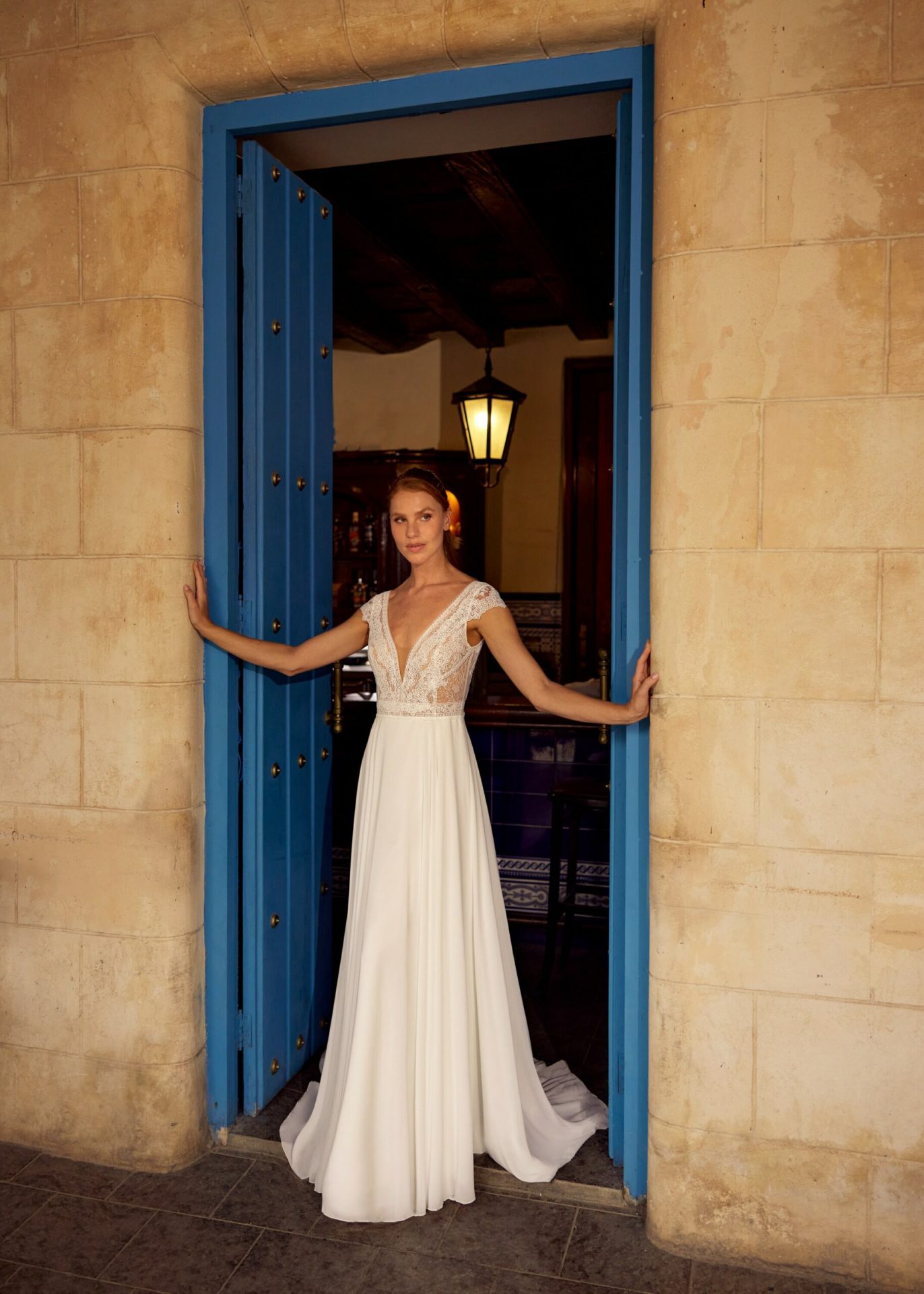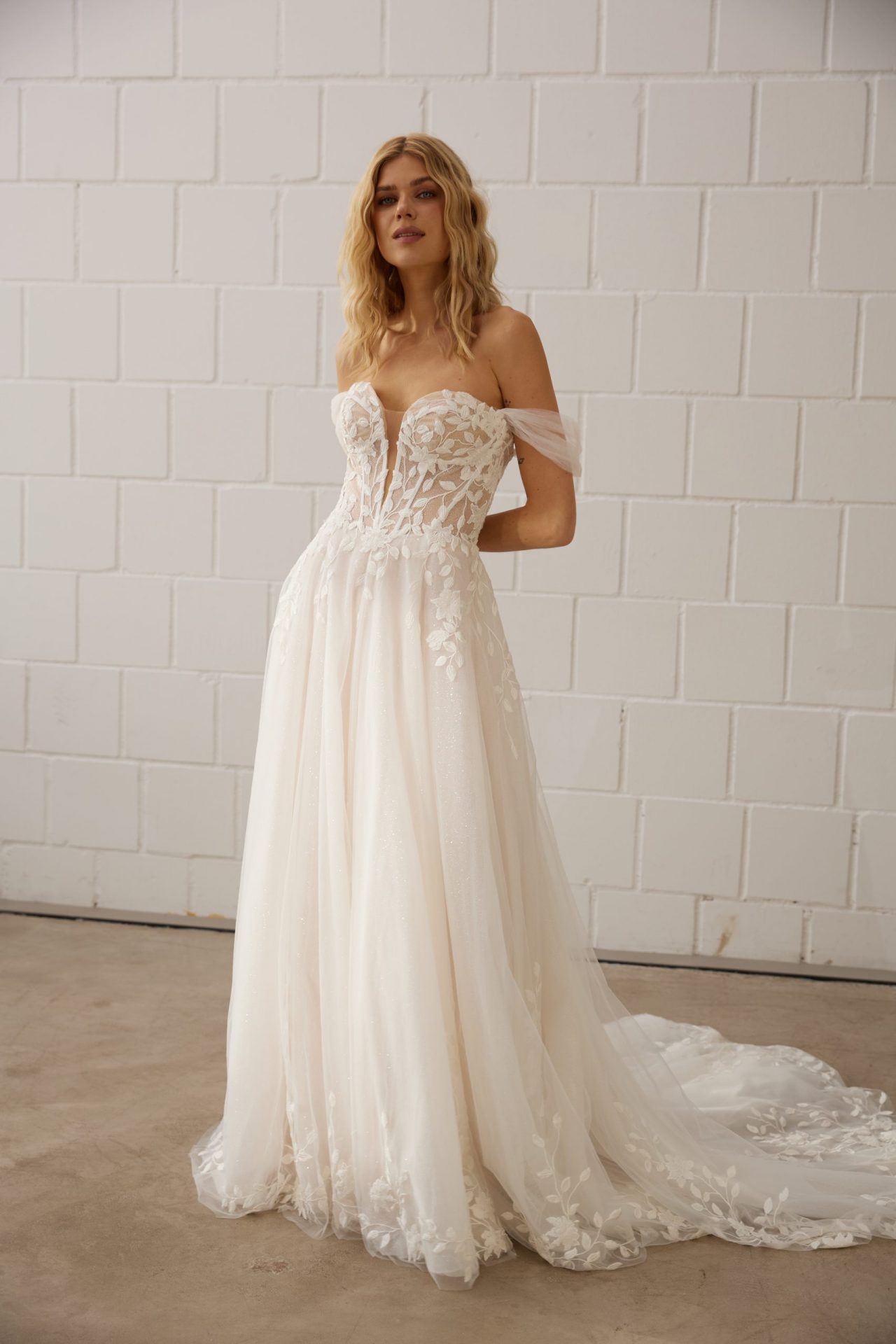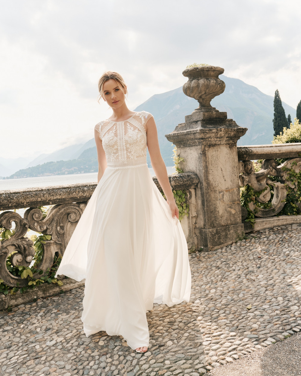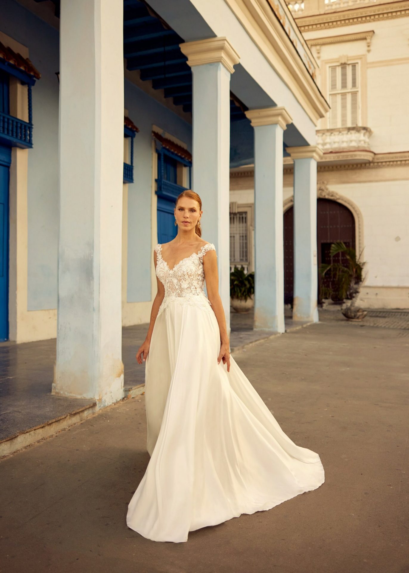Eine Brautkleid-Silhouette in klassischer A-Linie überzeugt mit einem figurbetonten Oberteil und leicht ausgestelltem Rock. Dieser zeitlose Schnitt aus hochwertiger Brautmode umschmeichelt verschiedene Körperformen und verleiht Dir einen eleganten Look für Deinen großen Tag. Durch weiche Materialien und dezente Details wirkt das Hochzeitskleid romantisch und modern zugleich